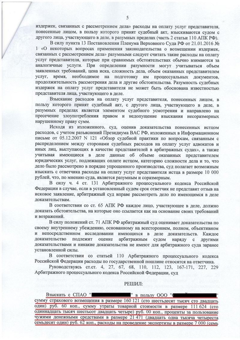 Адвокат разработал максимально удобную для клиента правовую позицию. Чтобы не ждать рассмотрения дела был принято решение обратиться с требованием к страховой компании о выплате страхового возмещения на основании досудебной экспертизы. Ответчик был приглашен на осмотр, однако, не принял в нем участия. После досудебной экспертизы клиент отремонтировал автомобиль и смог им пользоваться. Стоимость ремонта, а также утрата товарной стоимости, которую страховые компании всегда стараются не уплачивать в добровольном порядке – были заявлены в исковом заявлении, которое подлежало к рассмотрению арбитражным судом в упрощенном порядке, без вызова сторон.