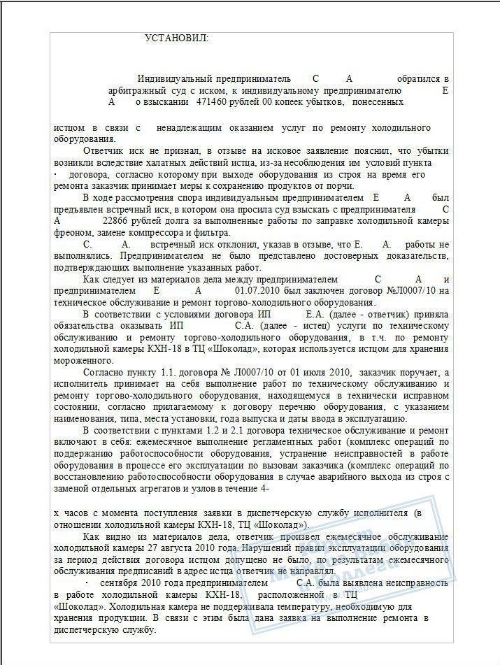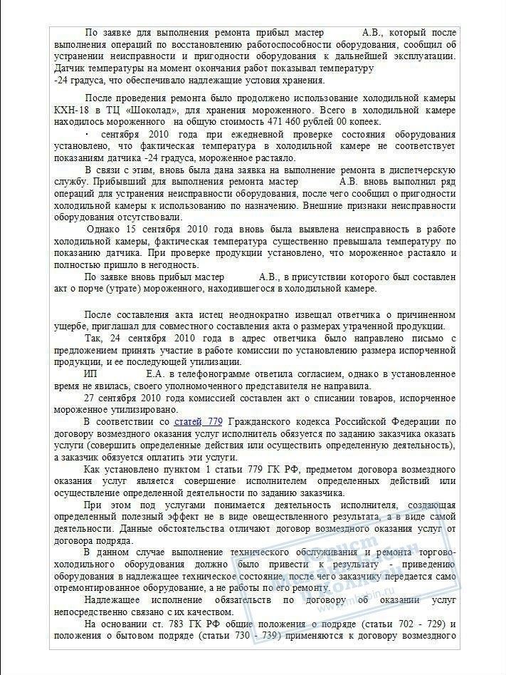 Несвоевременный и некачественный ремонт холодильной камеры привёл к порче мороженого на сумму свыше 450 000 руб. Обслуживающая организация отказалась платить. Адвокат доказал причинно-следственную связь и помог взыскать полную сумму убытков, а также отклонить встречный иск исполнителя.