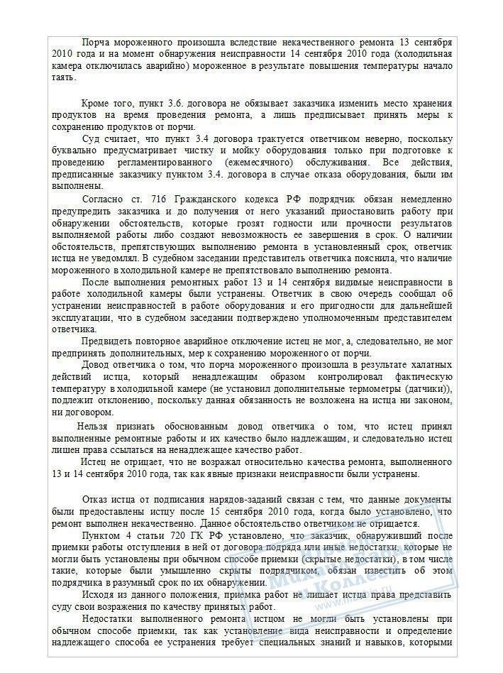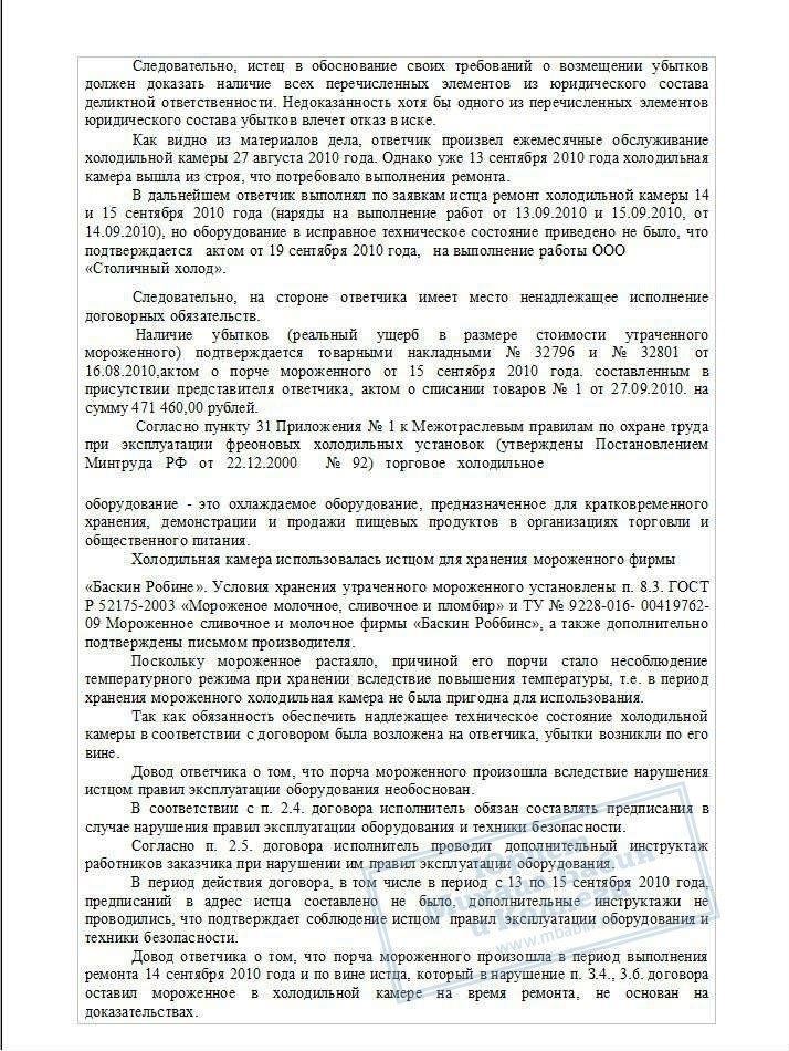 • Причинно-следственная связь. Из-за неисправности холодильной камеры температура хранения не соответствовала норме, в результате чего мороженое растаяло. Это подтверждено актом о порче от 15 сентября 2010 года, составленным в присутствии мастера ответчика, и актом о списании товара от 27 сентября 2010 года.
