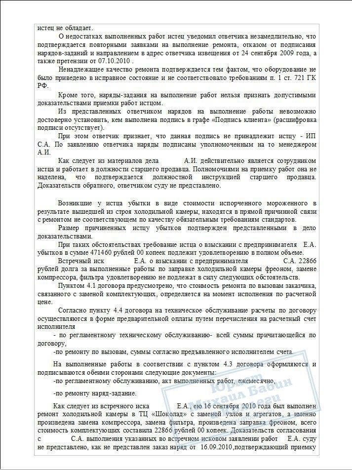 • Необоснованность встречного иска. Ответчик не представил доказательств согласования с истцом работ по замене компрессора и фильтра, а также надлежащей приёмки этих работ. Выставленный счёт на предоплату не подтверждал факт выполнения работ, поскольку заказчик отказался от их проведения, привлекая для ремонта третье лицо.