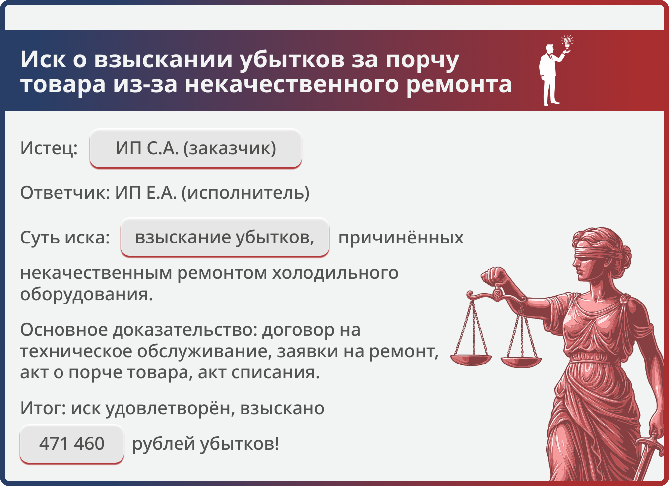 Взыскание 471 460 руб. убытков за порчу товара из-за некачественного ремонта холодильного оборудования
