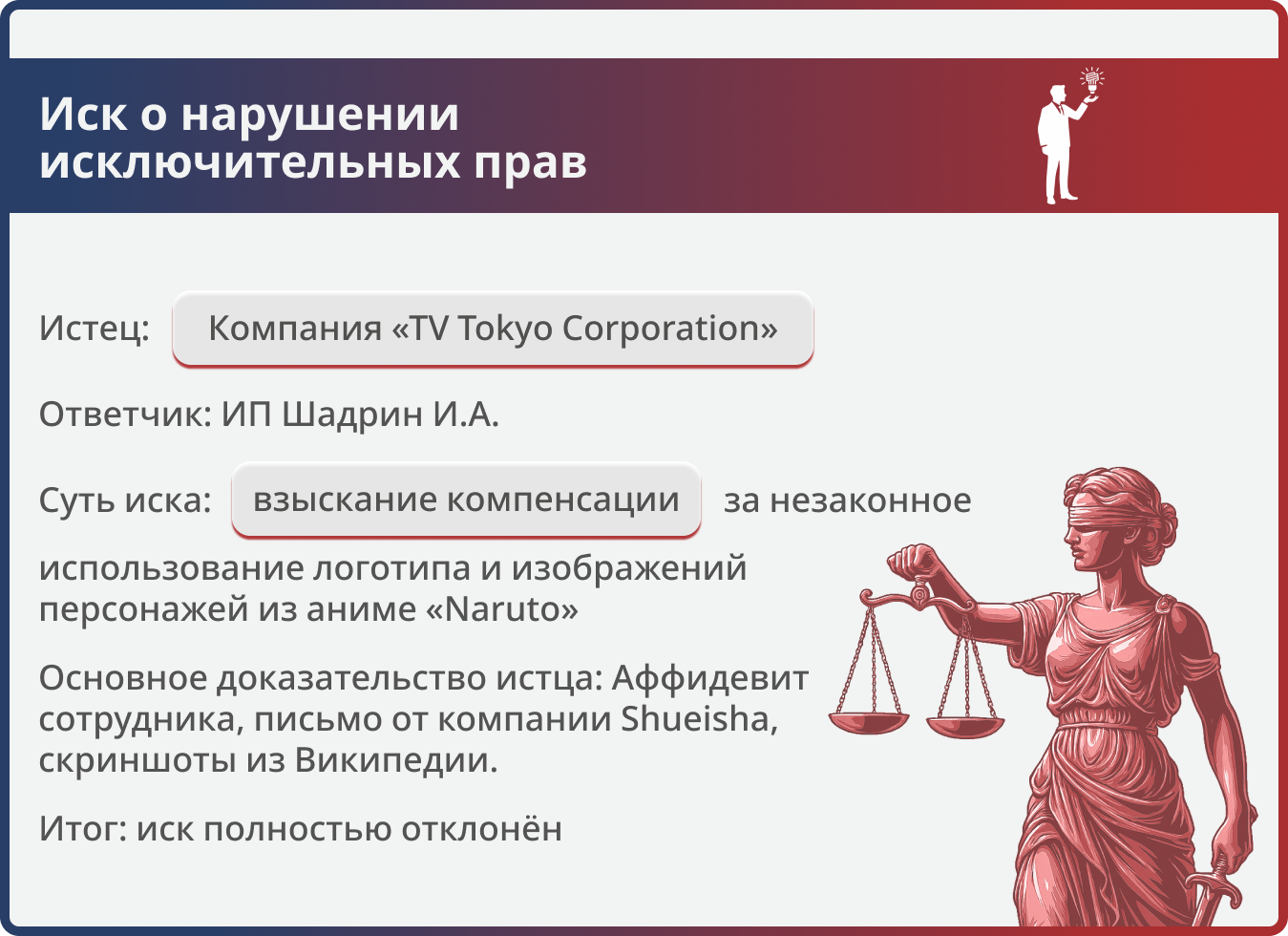 Иск был подан компанией «TV Tokyo Corporation» к двум индивидуальным предпринимателям, включая нашего клиента. Истец требовал взыскания компенсации за нарушение авторских прав, ссылаясь на своё эксклюзивное владение образами из аниме «Naruto». Ни истец, ни ответчики лично в заседаниях не участвовали, поэтому исход дела полностью зависел от качества представленных письменных доказательств и правовой аргументации.