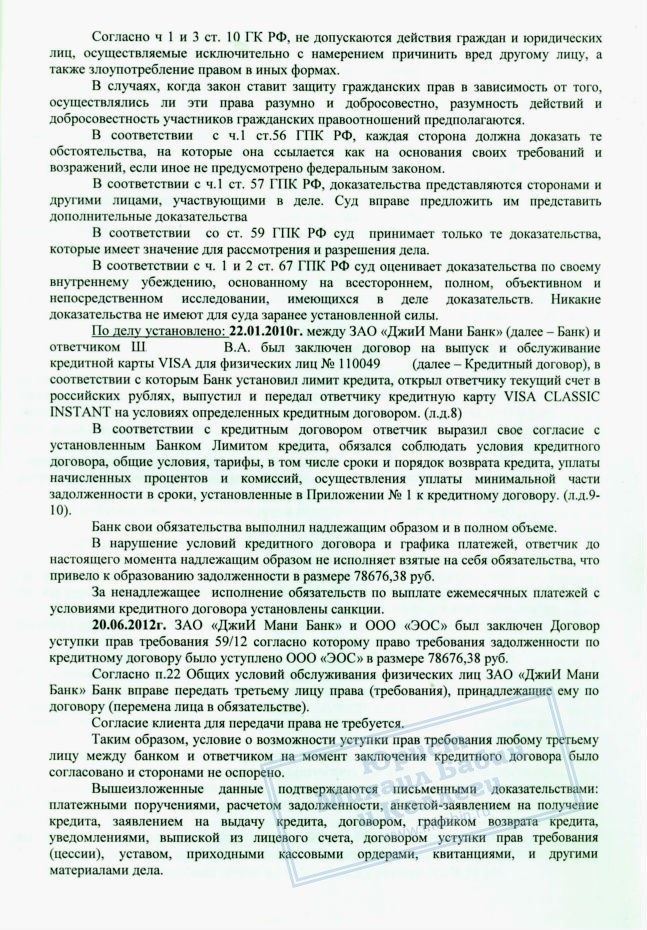 ЗАО «ДжиИ Мани Банк» передал права на взыскание непогашенной задолженности гражданина Ш. коллекторскому агентству ООО «ЭОС», которое подало на заемщика в суд.