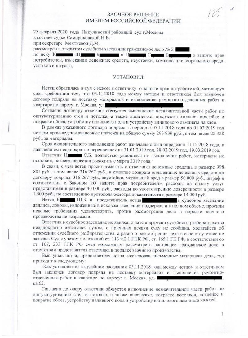Клиент К. обратился к адвокату после того, как подрядчик, который взял деньги за ремонт квартиры не выполнил работу и перестал выходить на связь. Сложность ситуации также заключалась в том, что у подрядчика не было статуса индивидуального предпринимателя, а услуги он оказывал как физическое лицо. В такой ситуации Закон РФ «О защите прав потребителей» не подлежит применению, а это означает, что иск пришлось бы подавать в г. Севастополь, по месту жительства ответчика, и не было бы возможности взыскивать повышенную неустойку и штраф.