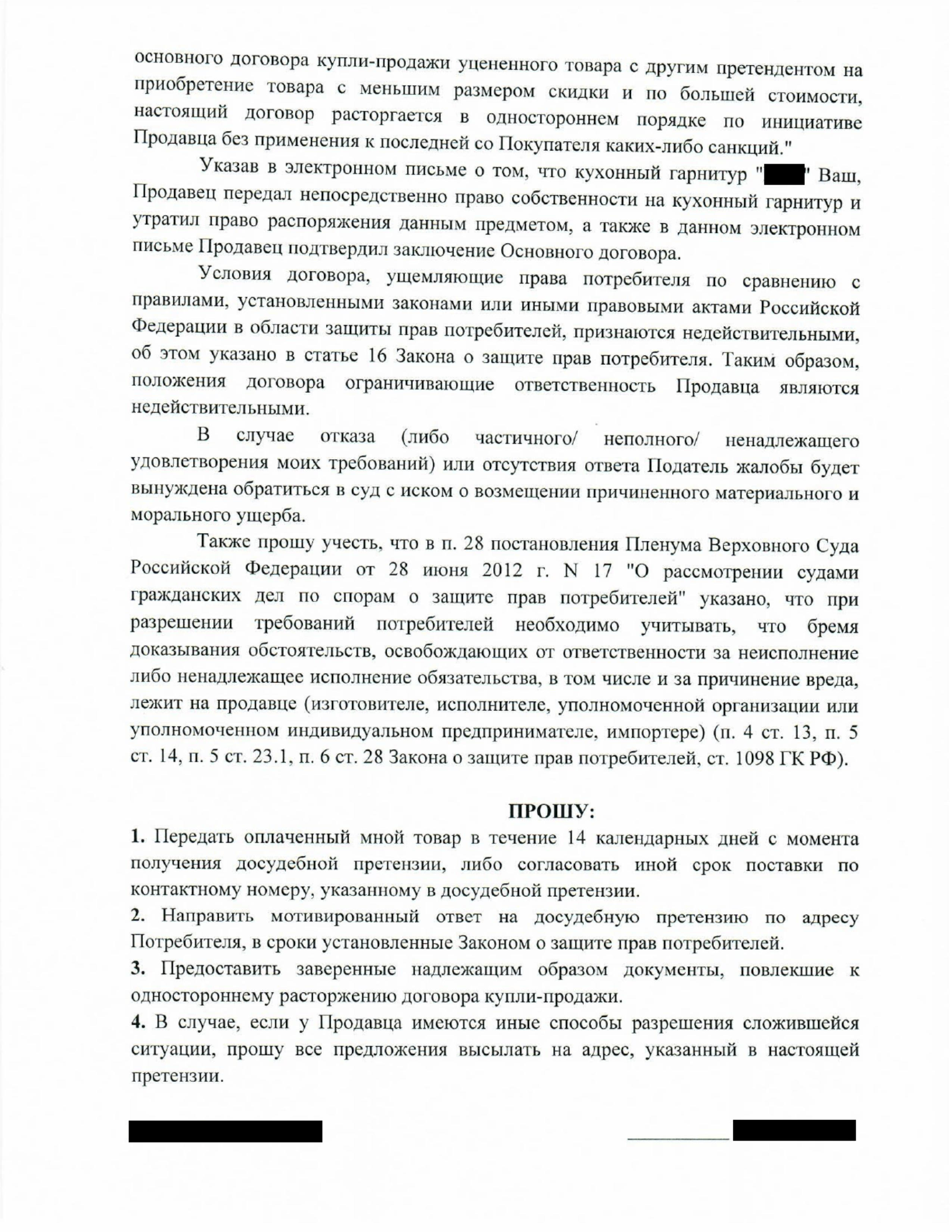 В целях мирного урегулирования вопроса, специалисты нашей компании обратились с досудебной претензией в адрес компании с требованием о передаче соответствующего товара клиентке.