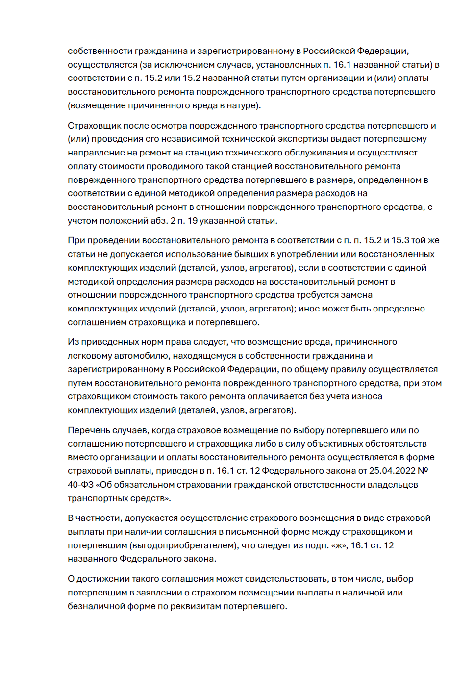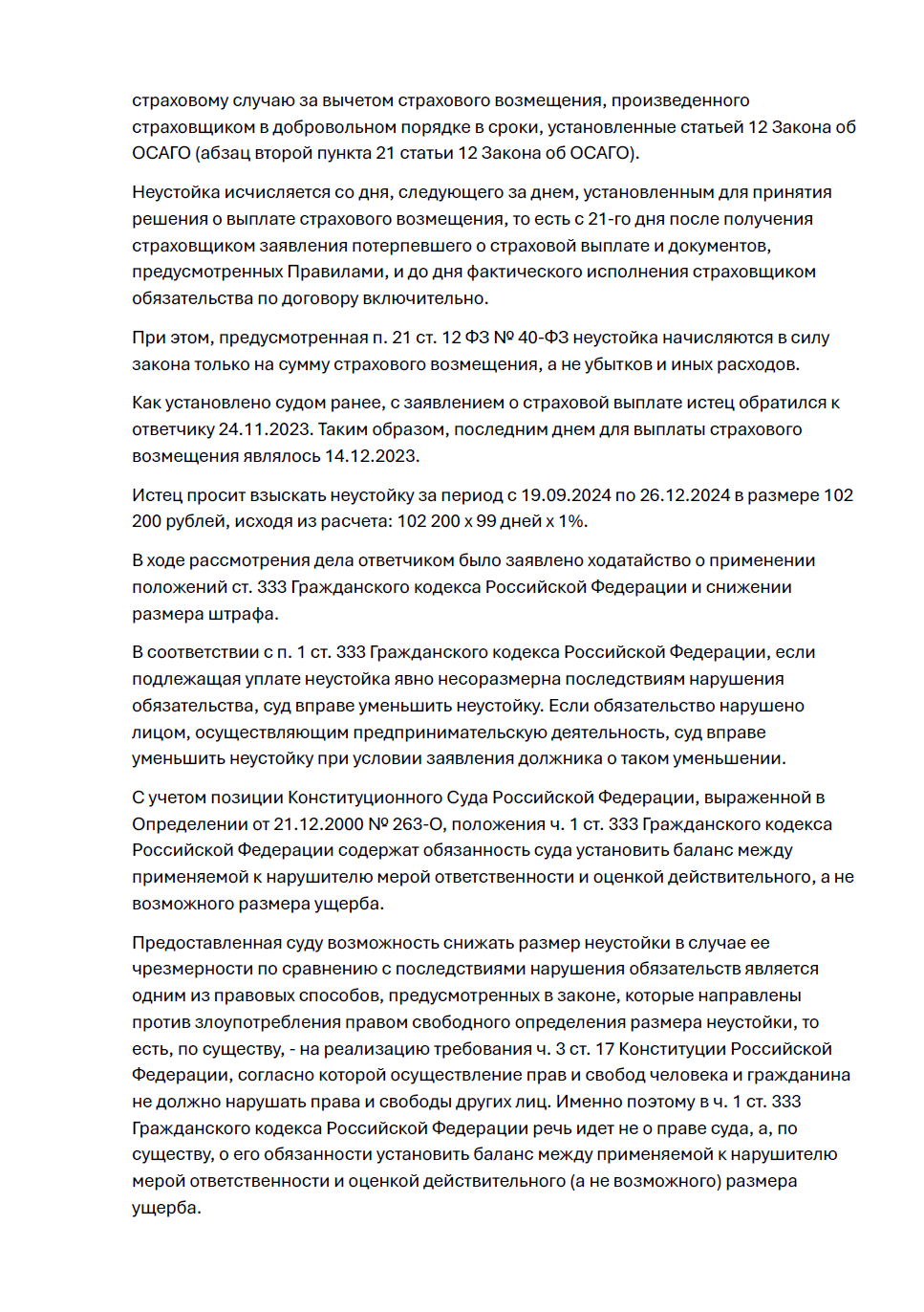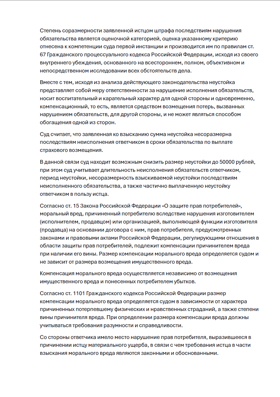 Мы инициировали и настояли на проведении судебной автотехнической экспертизы, которая, в отличие от заочных исследований страховой компании, основывалась на реальном осмотре автомобиля. Её вывод о наличии причинно-следственной связи стал центральным неопровержимым аргументом. Параллельно мы выстроили позицию на взыскание не только основного возмещения, но и всей сопутствующей ответственности страховщика за необоснованный отказ и просрочку.