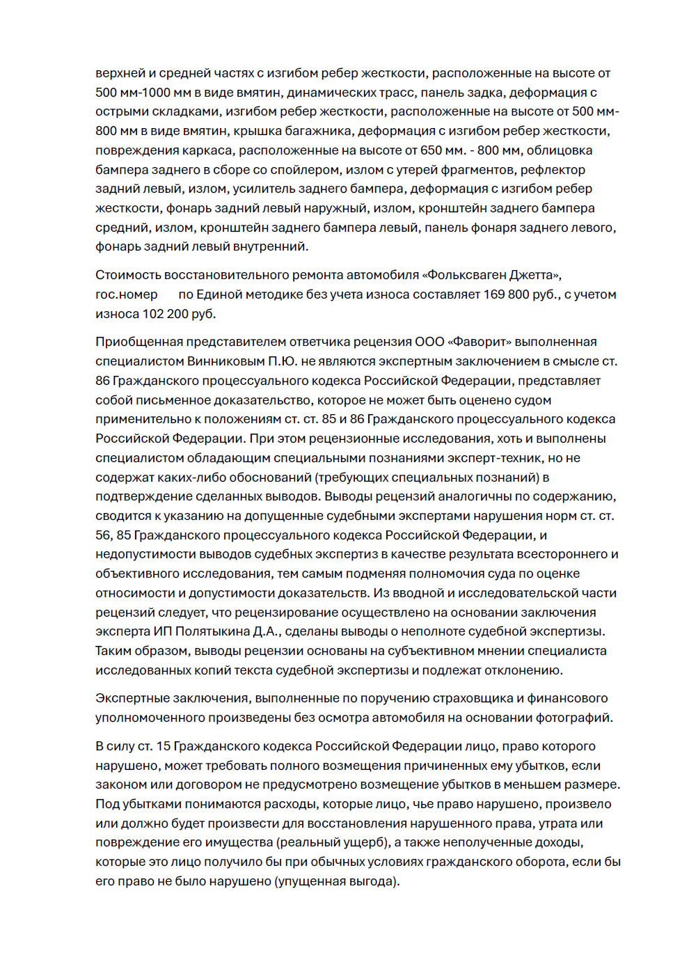 Наш клиент, владелец автомобиля Volkswagen, стал участником ДТП в Екатеринбурге. Виновником аварии был признан водитель другого автомобиля, о чем стороны составили европротокол. Несмотря на это, страховая компания виновника — ПАО СК «Росгосстрах» — после проведения собственного трассологического исследования заявила, что повреждения на автомобиле клиента не связаны с заявленным ДТП, и отказала в выплате. Клиенту было предложено подписать соглашение на сумму 178 400 рублей (без учета износа), но, не согласившись с выводами страховщика, он обратился за юридической помощью.