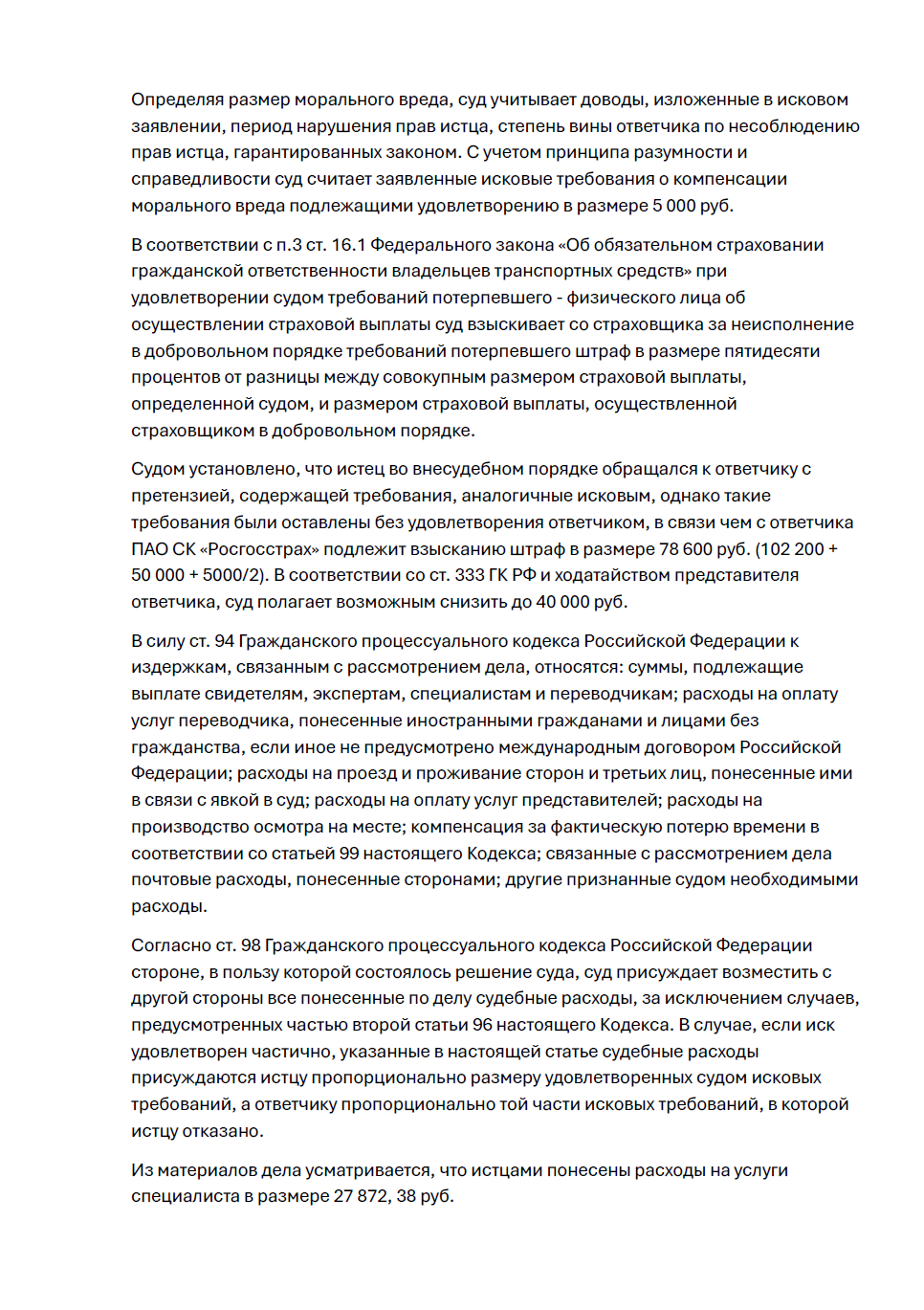 Страховая компания отказала клиенту в выплате, утверждая, что повреждения автомобиля не соответствовали обстоятельствам ДТП. Наша задача была доказать причинно-следственную связь и незаконность отказа. В результате суд не только признал случай страховым, но и взыскал в пользу клиента полагающееся возмещение, неустойку, штраф, компенсацию морального вреда и судебные издержки.