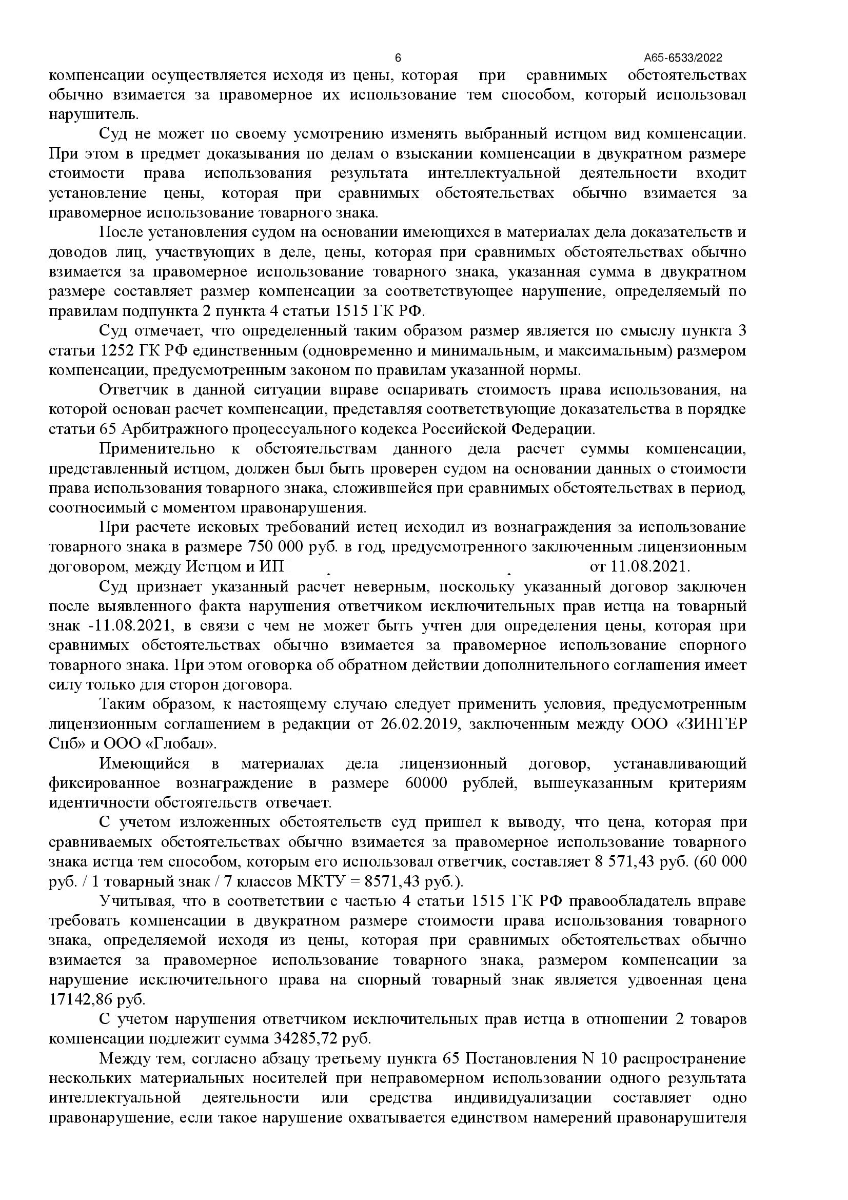Снижение компенсации за нарушение прав на товарный знак «ZINGER» с 375 000 до 17 000 руб.