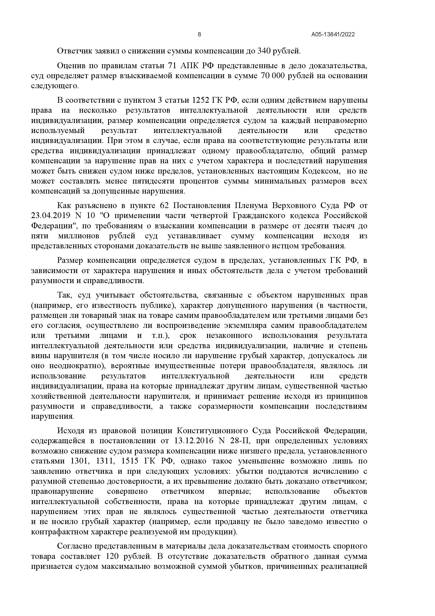 Также защита ссылалась на возможность снижения компенсации на основании пункта 3 статьи 1252 ГК РФ, поскольку все права принадлежат одному правообладателю.
