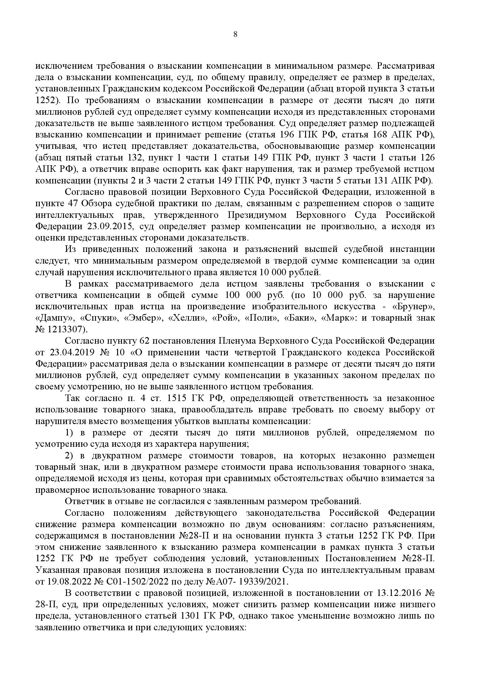 Истец (ROI VISUAL Co., Ltd., Республика Корея) обратился в суд с иском к ИП о взыскании 100 000 руб. компенсации за нарушение исключительных прав на товарный знак и 9 произведений изобразительного искусства — изображения персонажей анимационного сериала «Робокар Поли» (Эммер, Хэлли, Поли, Рой, Марк, Баки, Скул Би, Брунер, Дампу). Основание — продажа в торговой точке ответчика контрафактной игрушки, содержащей указанные обозначения. Ответчик представил отзыв с возражениями и заявил о снижении компенсации. Дело рассмотрено в общем исковом порядке.