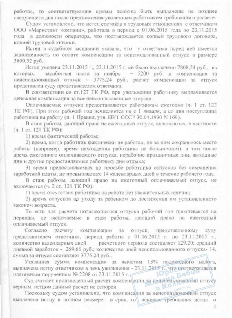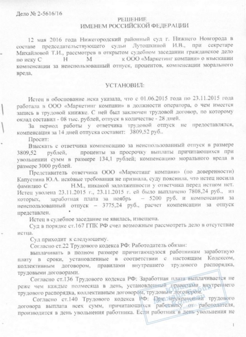 С.Н. обратилась в суд на ООО "МК" с требованием компенсации за неиспользованный отпуск и компенсации морального вреда. Юрист, специализирующаяся на трудовых взаимоотношениях, выступала в суде на стороне работодателя. На судебном заседании ей удалось доказать, что требования С.Н. безосновательны, так как все причитающиеся ей выплаты были произведены при увольнении в полном объеме.