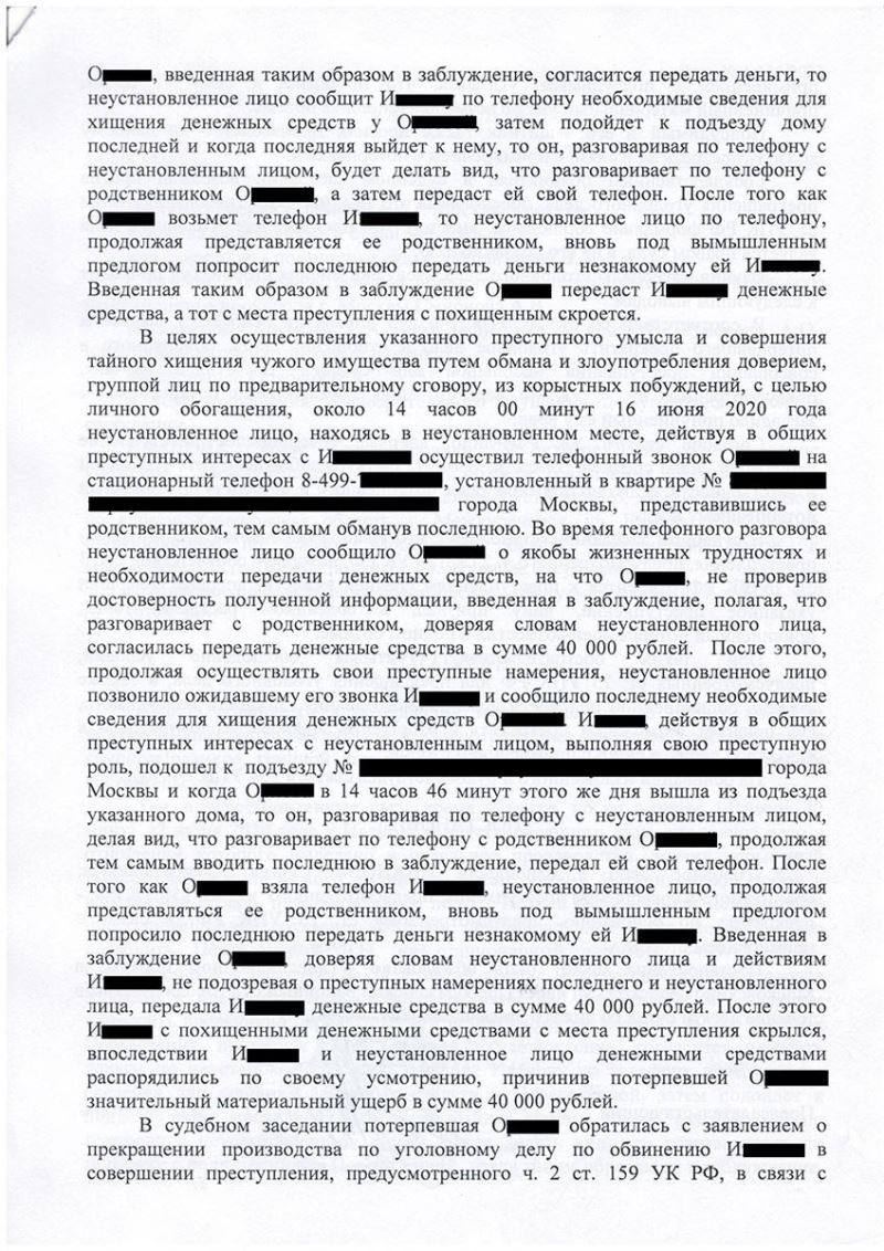 Клиент И. обвинялся в совершении преступления, предусмотренного ч. 2 ст. 159 УК РФ – мошенничество. Уголовное дело было передано в суд.