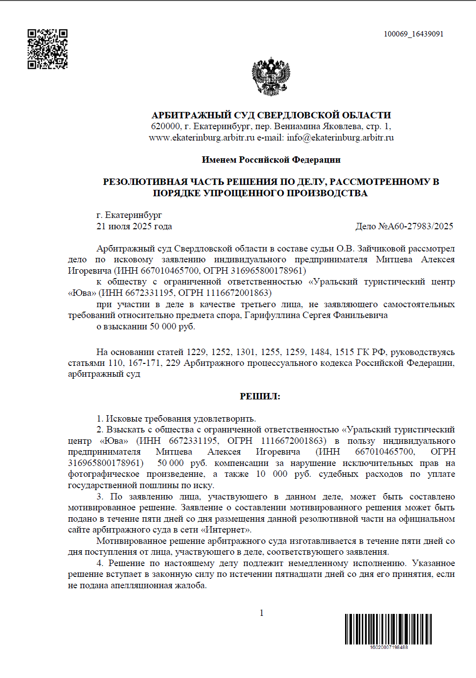 Дело рассматривалось Арбитражным судом Свердловской области в порядке упрощенного производства. Это позволило оперативно защитить интересы клиента без затягивания процесса, на основании представленных письменных доказательств. Суд изучил доводы истца и пришел к выводу о наличии состава правонарушения со стороны ООО «Уральский туристический центр «Юва».
