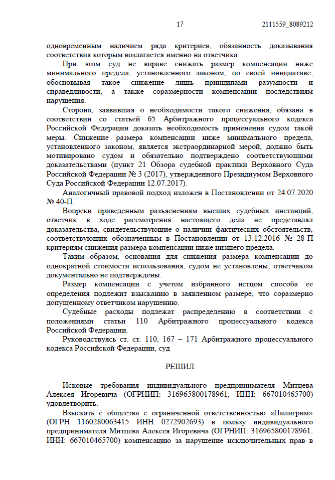 • Показали суду, что группа и официальный сайт компании связаны перекрестными ссылками, а номера телефонов в соцсети совпадают с контактами фирмы. Это подтвердило, что нарушение совершено именно ООО «Пилигрим» в коммерческих целях.