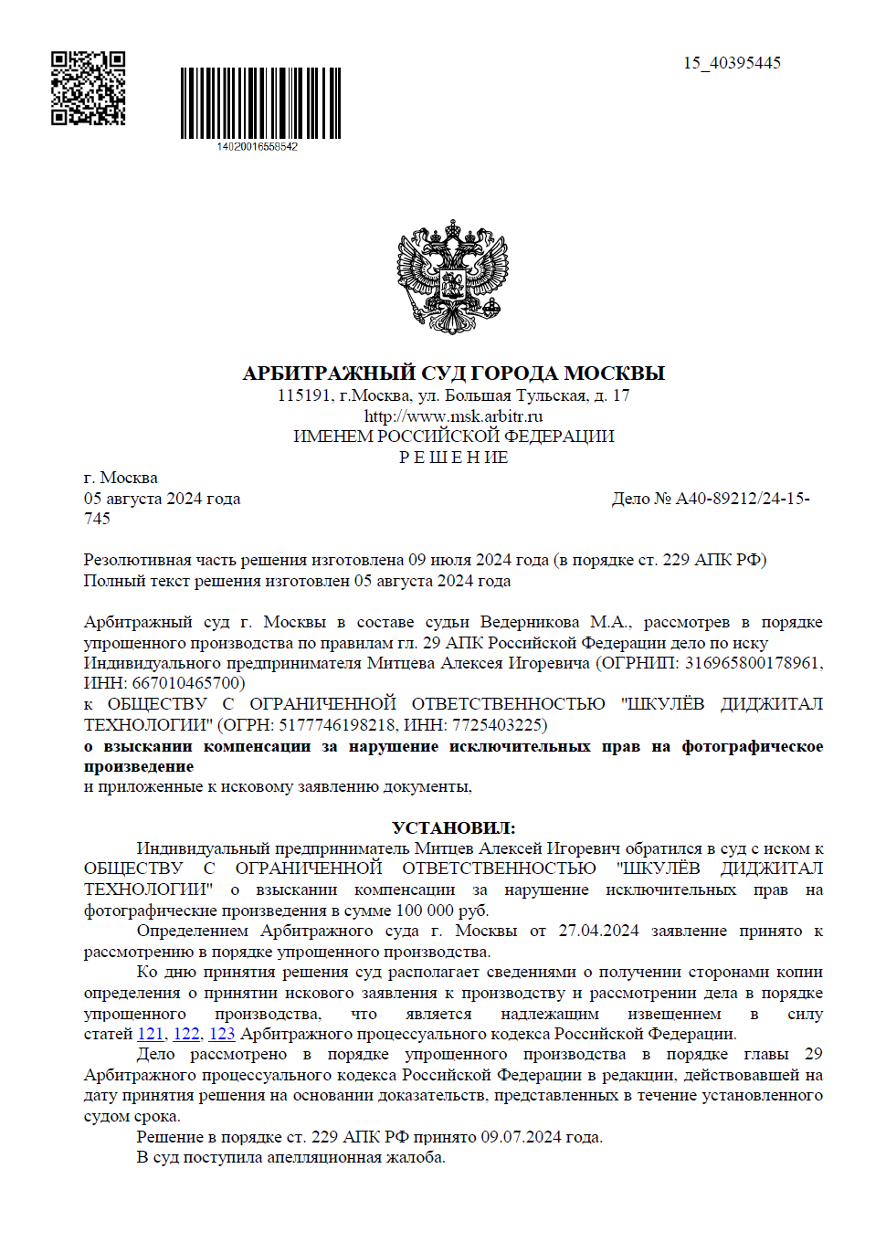Арбитражный суд города Москвы полностью удовлетворил исковые требования. С ООО «Шкулёв Диджитал Технологии» взыскано: