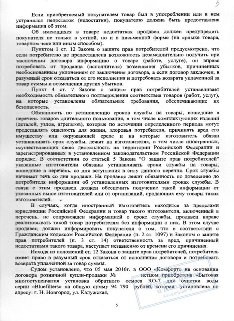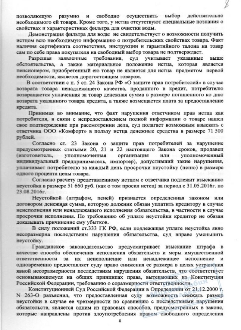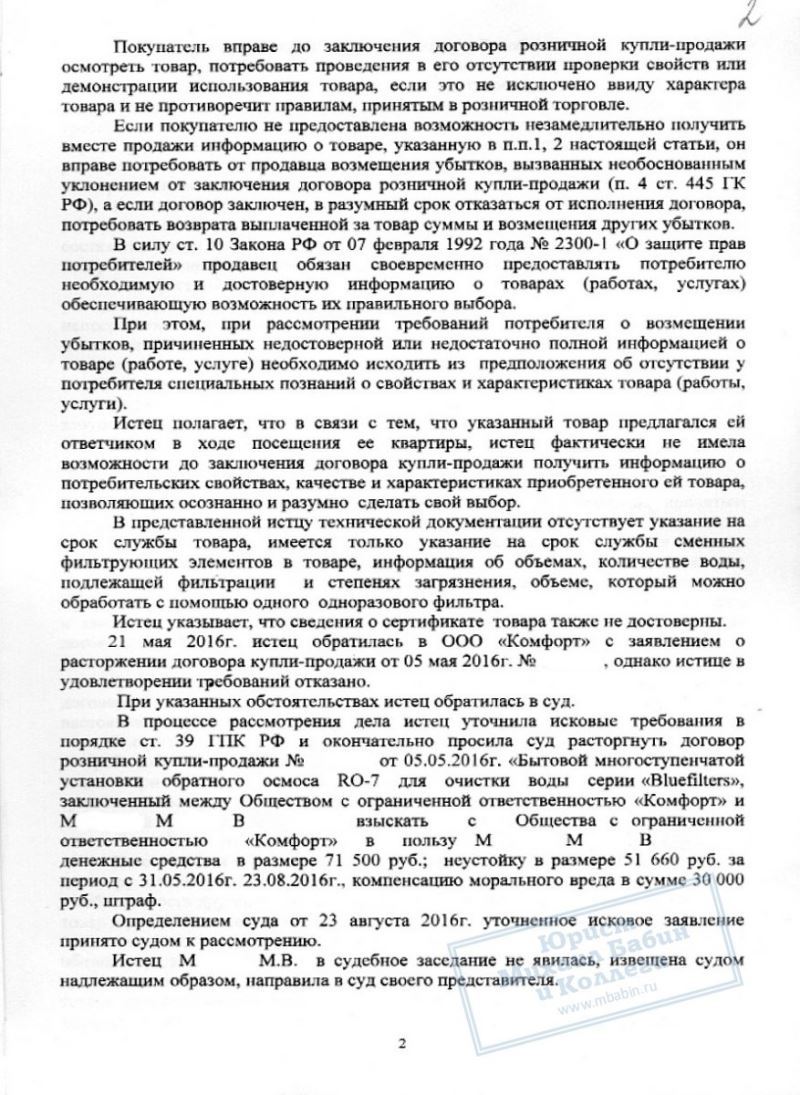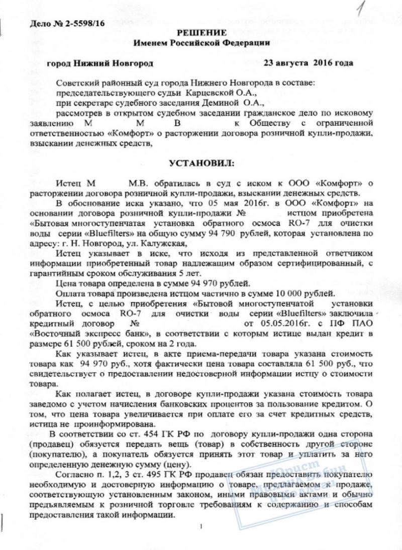 Предложение проверки качества водопроводной воды показалось М.М. полезным мероприятием. Однако, после демонстрации серии лабораторных опытов М.М. оказалась владелицей "Бытовой многоступенчатой установки обратного осмоса для очистки воды "Bluefilters" и кредита на 94 000 руб., сроком на 2 года. Взвесив реальные выгоды спонтанной покупки, М.М. поняла, что это была ее ошибка и попыталась вернуть товар организации. Но ей было отказано.