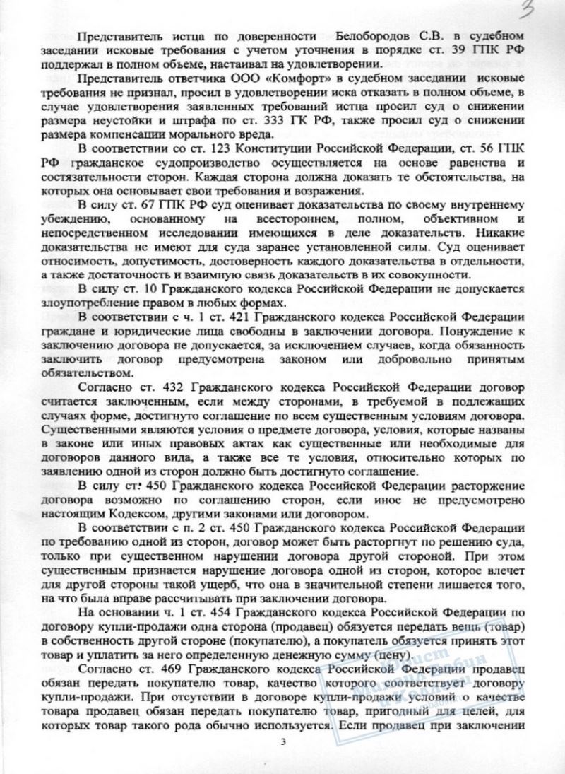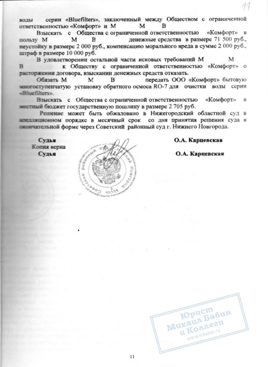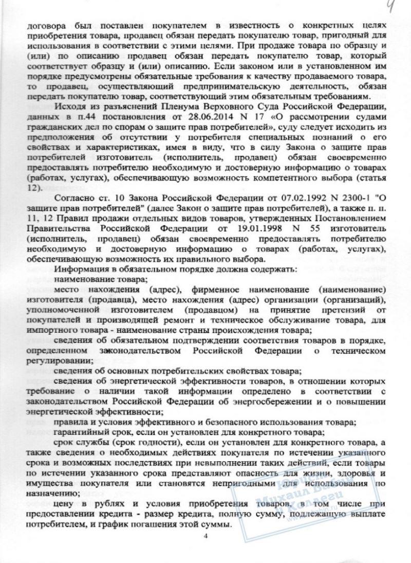 Юрист подготовил доказательства того, что продавец нарушил права М.М., как потребителя, и представил её дело в суде. Это позволило не только расторгнуть договор купли-продажи и вернуть ее деньги, но и взыскать с фирмы в пользу нашей клиентки 14 тыс.руб. возмещения.