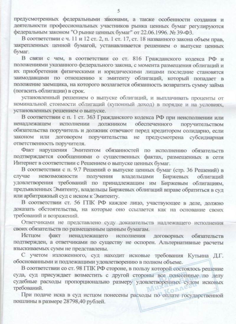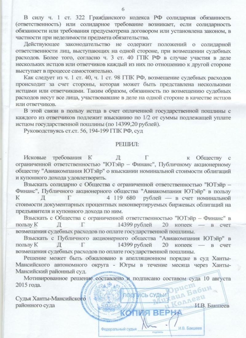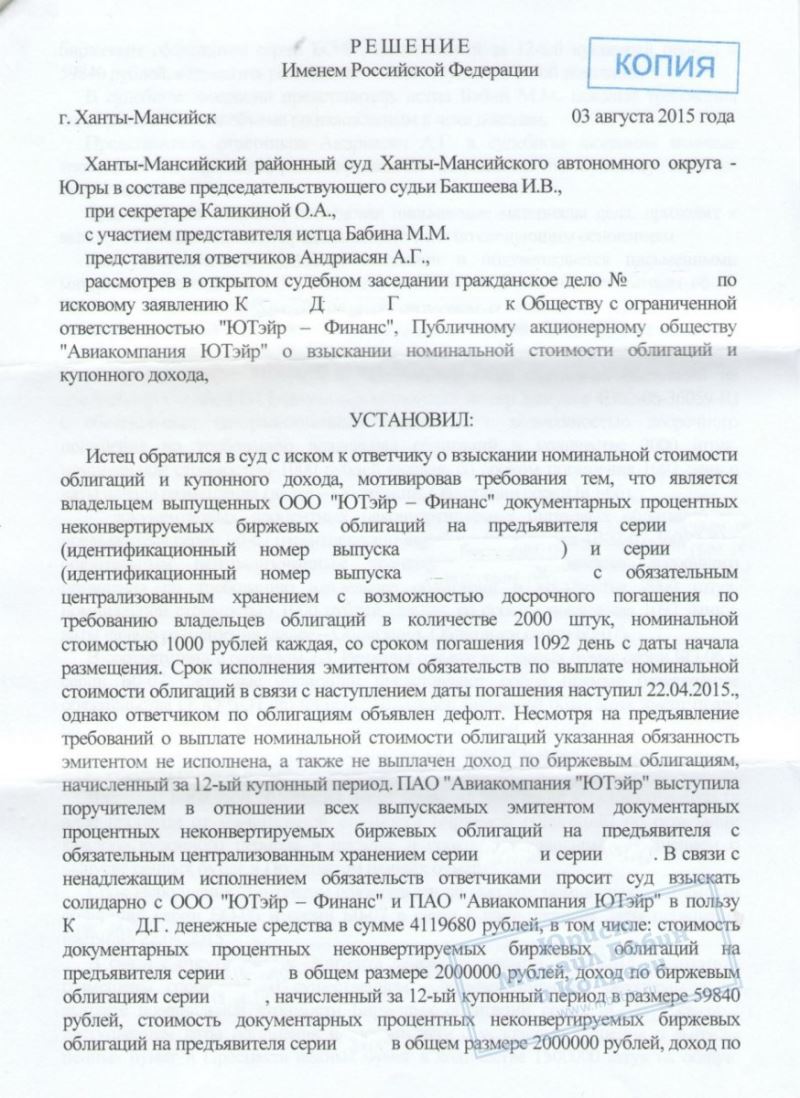 Дело было направлено в суд Ханты-Мансийского округа и оказалось первым выигранным спором против "Авиакомпании ЮТэйр" в Ханты-Мансийске. Суд постановил взыскать сумму номинальной стоимости биржевых облигаций и купонный доход солидарно с обеих организаций в пользу нашего клиента.
