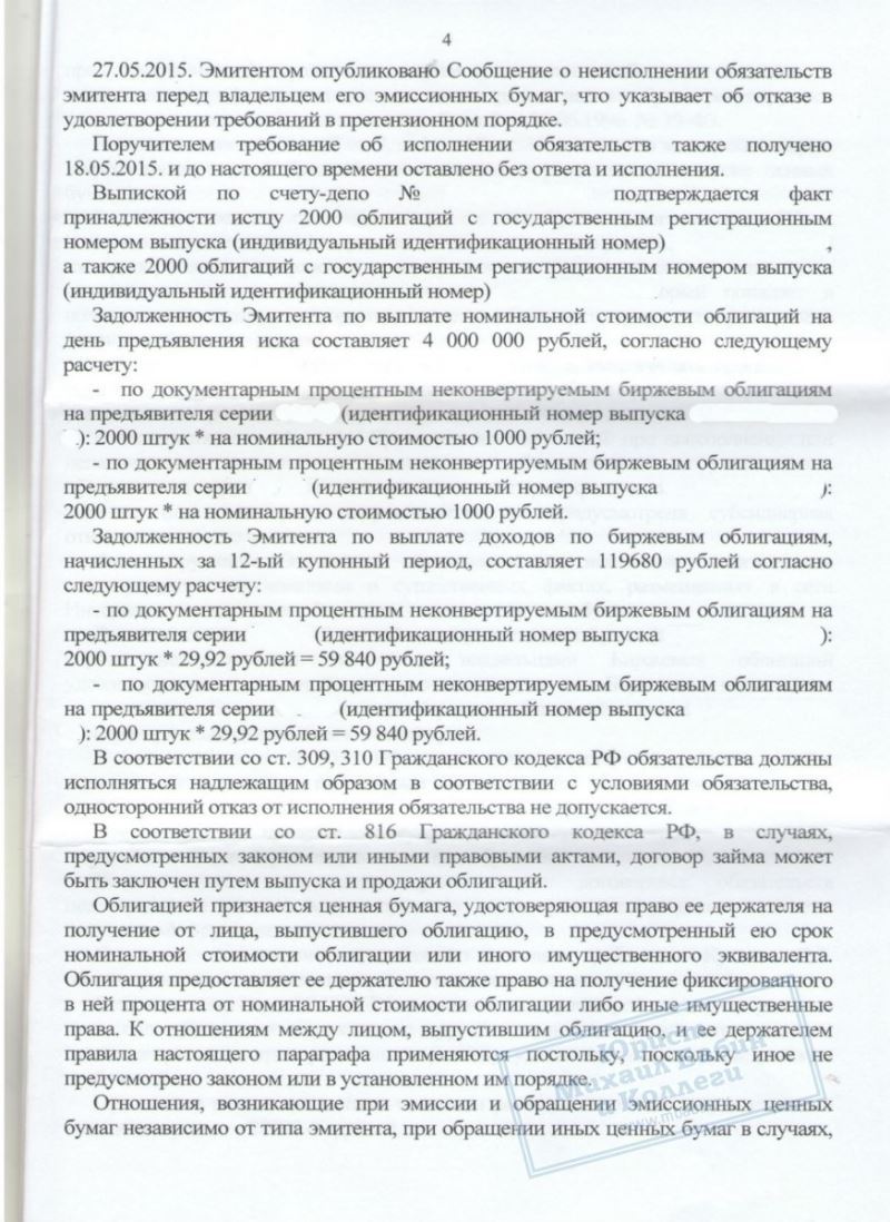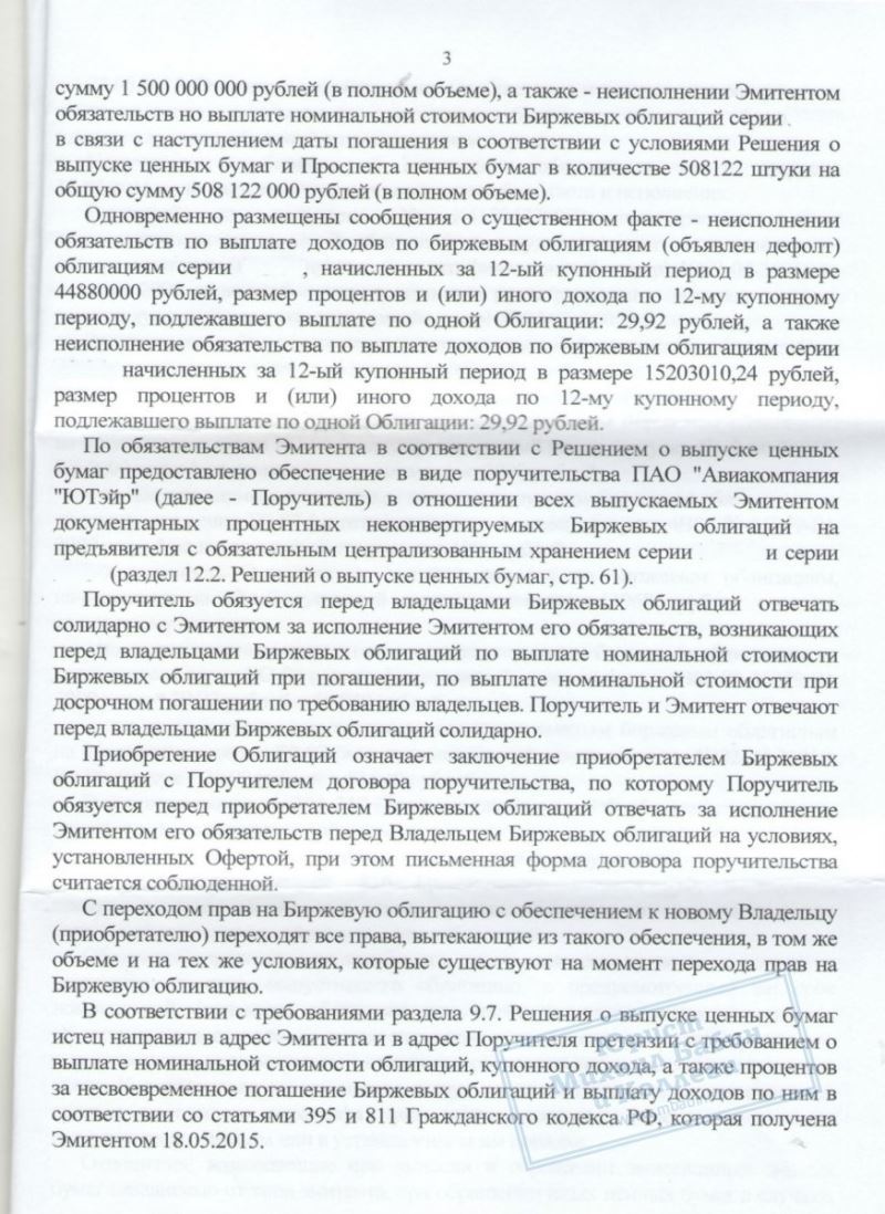 Более года длились судебные разбирательства коллегии против компаний ООО "ЮТэйр-Финанс" и ПАО "Авиакомпания "ЮТэйр" по вопросу о взыскании купонного дохода и номинальной стоимости облигаций. Дело было решено в пользу нашего клиента и в 10.01.17 полностью закрыто после отказа авиакомпании в апелляции.