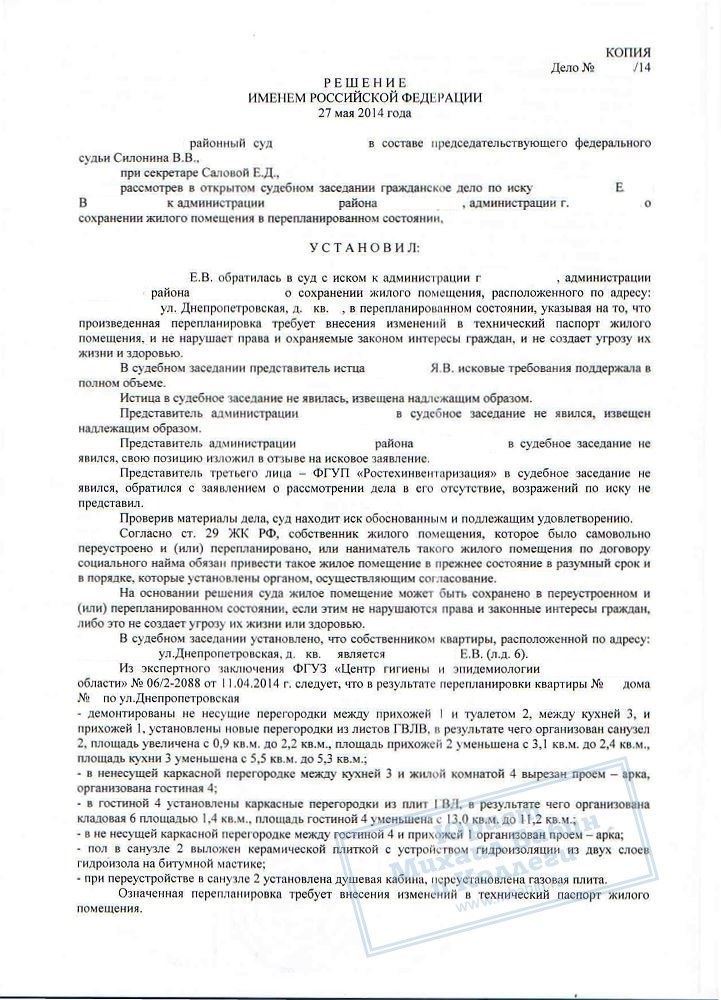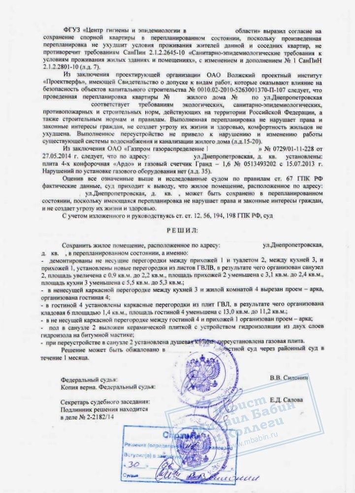 Юристы компании готовили необходимый комплект документов на перепланировку и представляли интересы доверителя в суде.