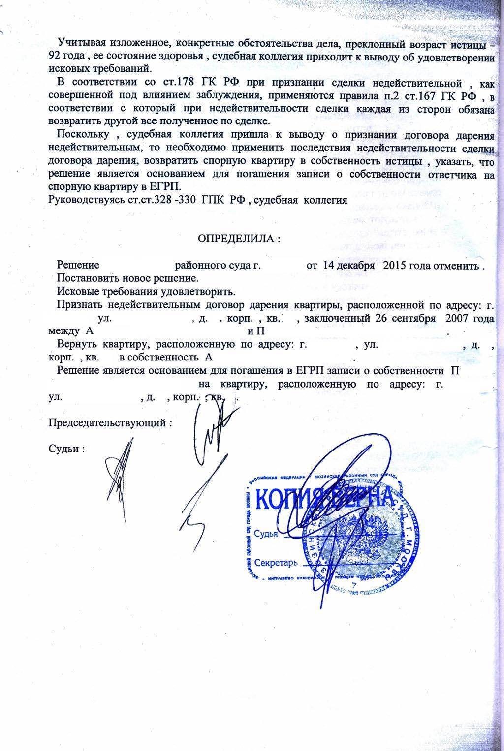 Судебная коллегия, учитывая изложенные факты, пришла к выводу об удовлетворении исковых требований, постановив отменить решение районного суда, признать недействительной сделку дарения, вернуть однокомнатную квартиру в собственность истицы.